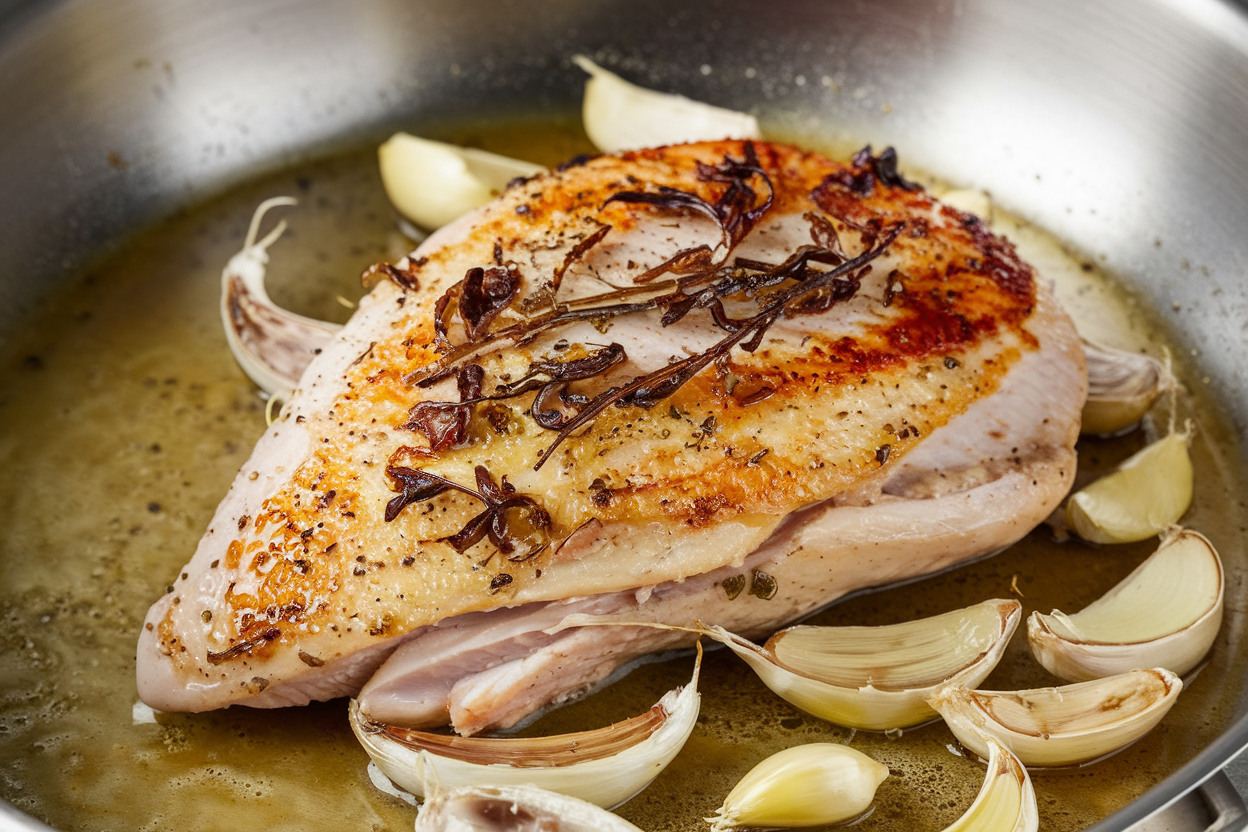 - Flip and flavor: Flip the breasts skin-side up. Add the butter, smashed garlic, and herbs to the pan. Tilt and baste the chicken with the foaming butter for 30–45 seconds.